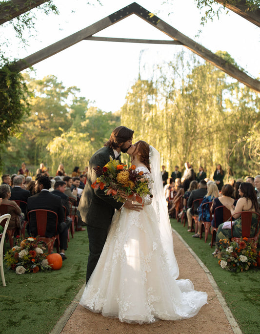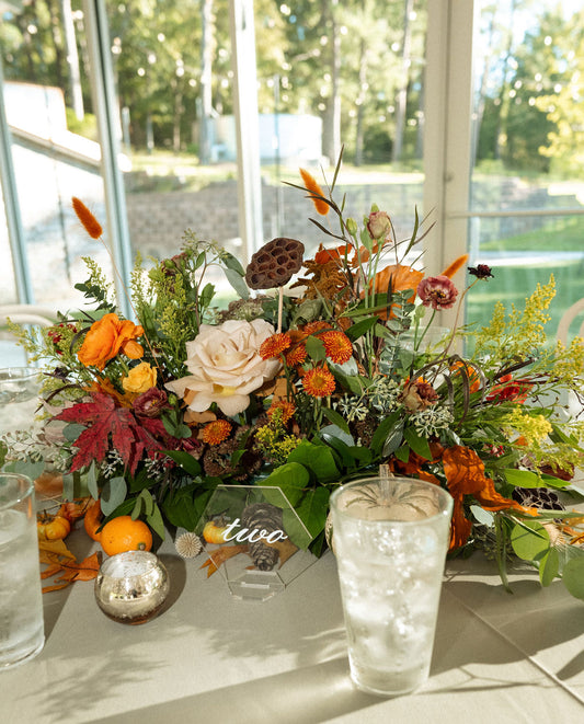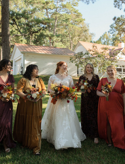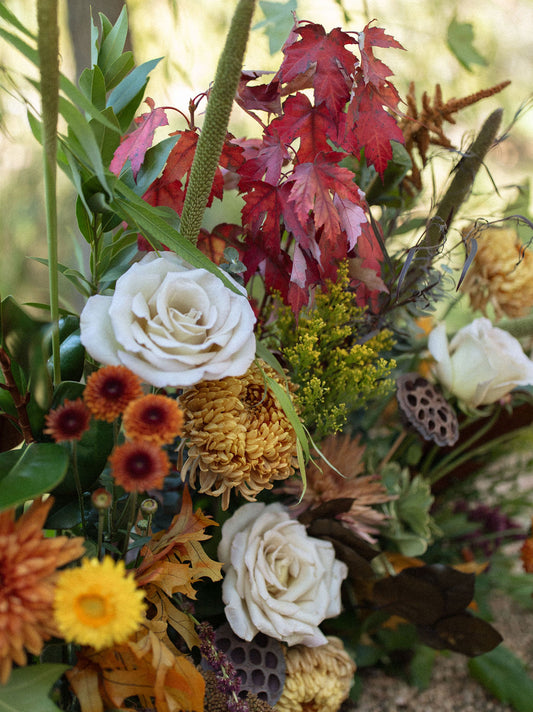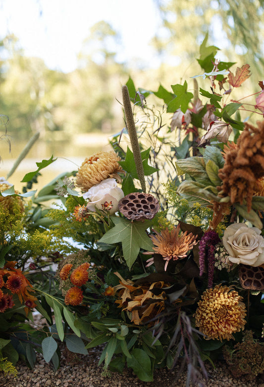 Organic and natural style with lots of textural elements and foliage, such as copper beach branches and grasses with blooms in shades of burnt orange, golden yellow, blush, rust, and burgundy.