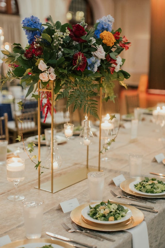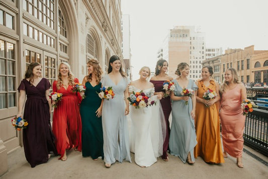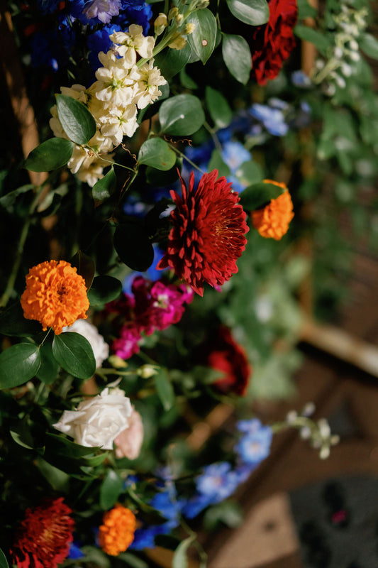 Bring in all the color and all the glam vibes with this jewel tone collection. Flowers in shades of ruby, burgundy, blue, orange, and purple with pops of emerald green foliage.
